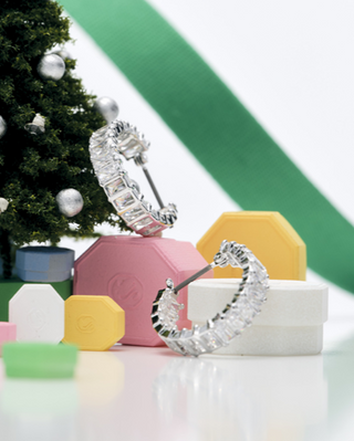 Curate a joyful party look with stacks of clear crystals. Mix and match studs, hoops, and drop earrings for bold radiance.