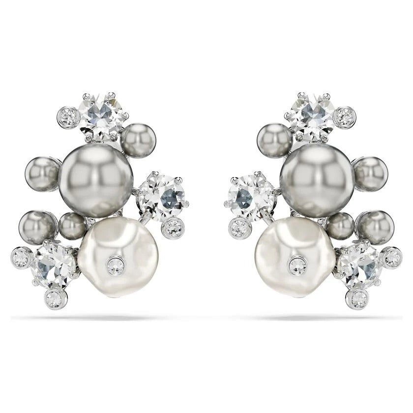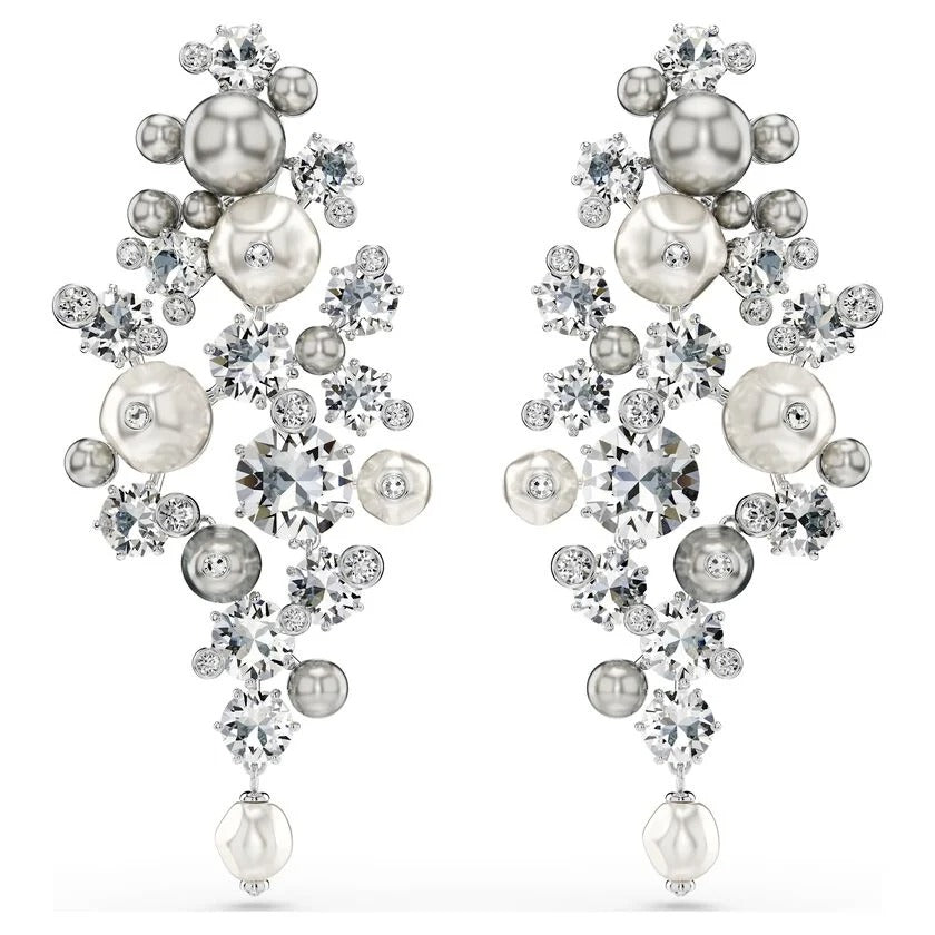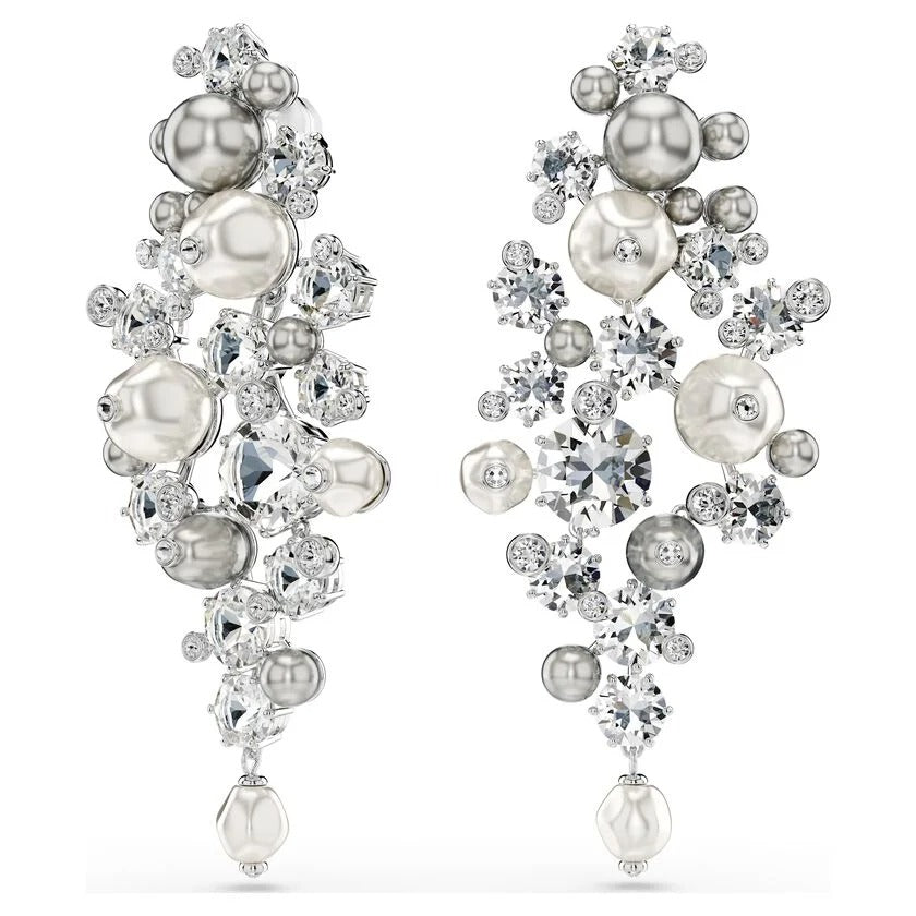 Curate the perfect look of elegance with these statement clip earrings. Showcasing an intricate level of savoir-faire, each rhodium plated piece features various sizes of clear crystals and white and gray Swarovski Crystal Pearls, combining to create a truly refined appearance. For ultimate versatility, the bottom section is detachable, allowing the earrings to be worn as a chandelier style or a smaller clip. Pair them with the matching Constella choker or brooch to truly steal the spotlight.