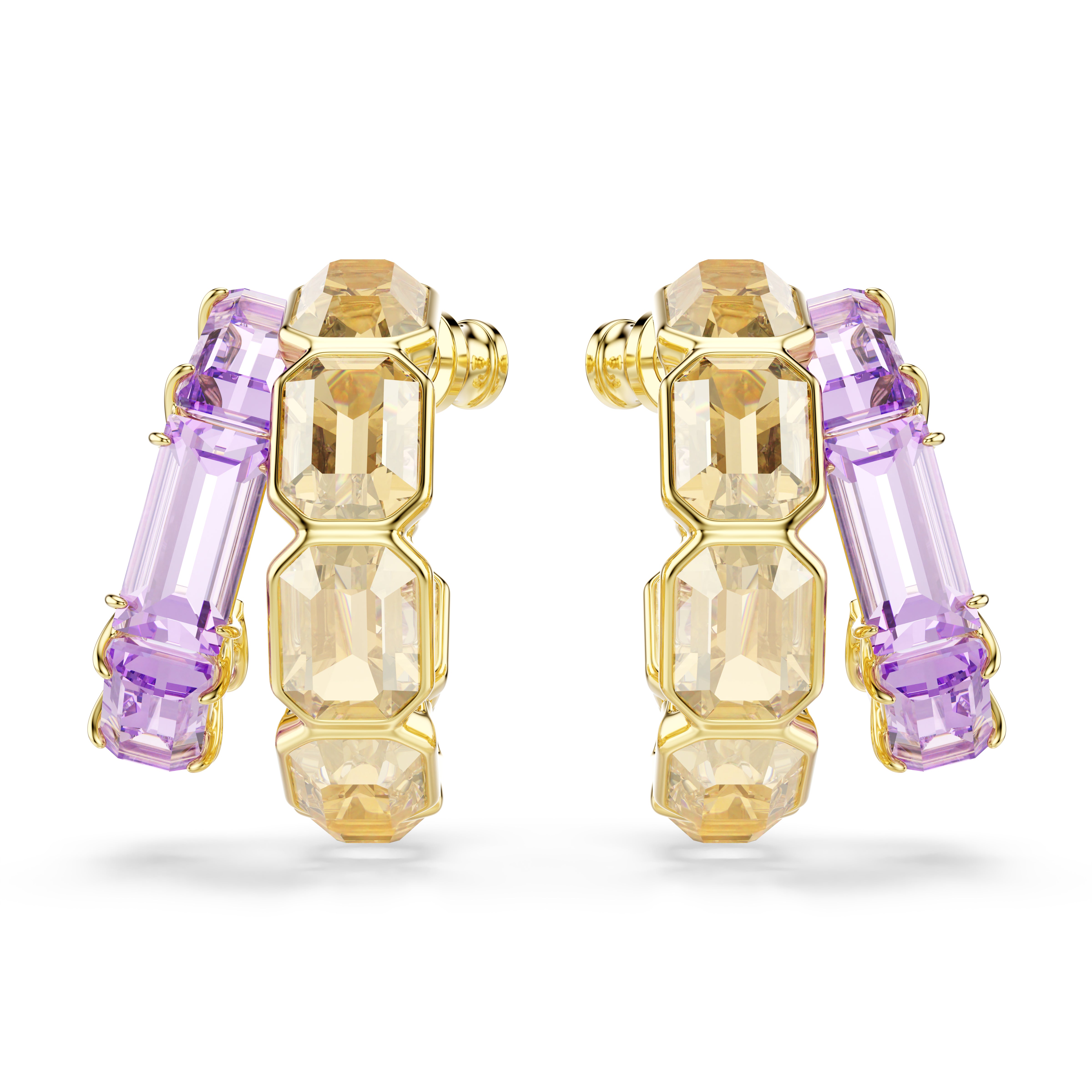 These multicolored earrings are the choice for all-out glamour. Each gold-tone plated piece features two asymmetrical mini hoops, with octagonal caramel crystals in a bezel setting, and purple crystals in a prong setting. A beautiful mix of contrasts that come together for one bold look. Wear these earrings alongside matching pieces from the same family to accentuate the effect.
