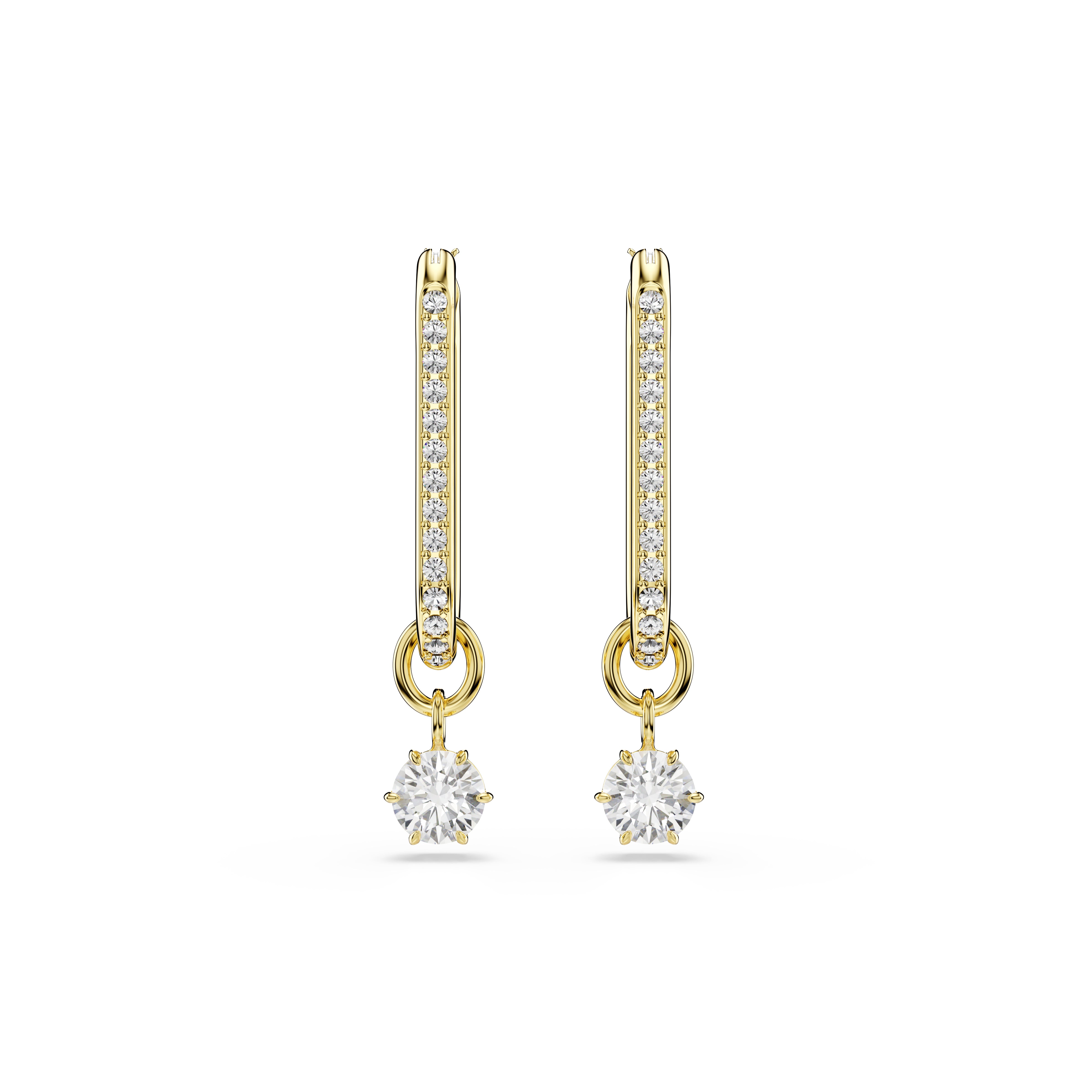 Brighten every day with the gleaming intensity of these gold-tone plated earrings. Each elongated hoop is adorned in shimmering pavé, with a prong-set Swarovski Zirconia that delicately hangs beneath. A wondrous alternative to the classic hoop style that is inspired by the stellar elegance of the Constella family.