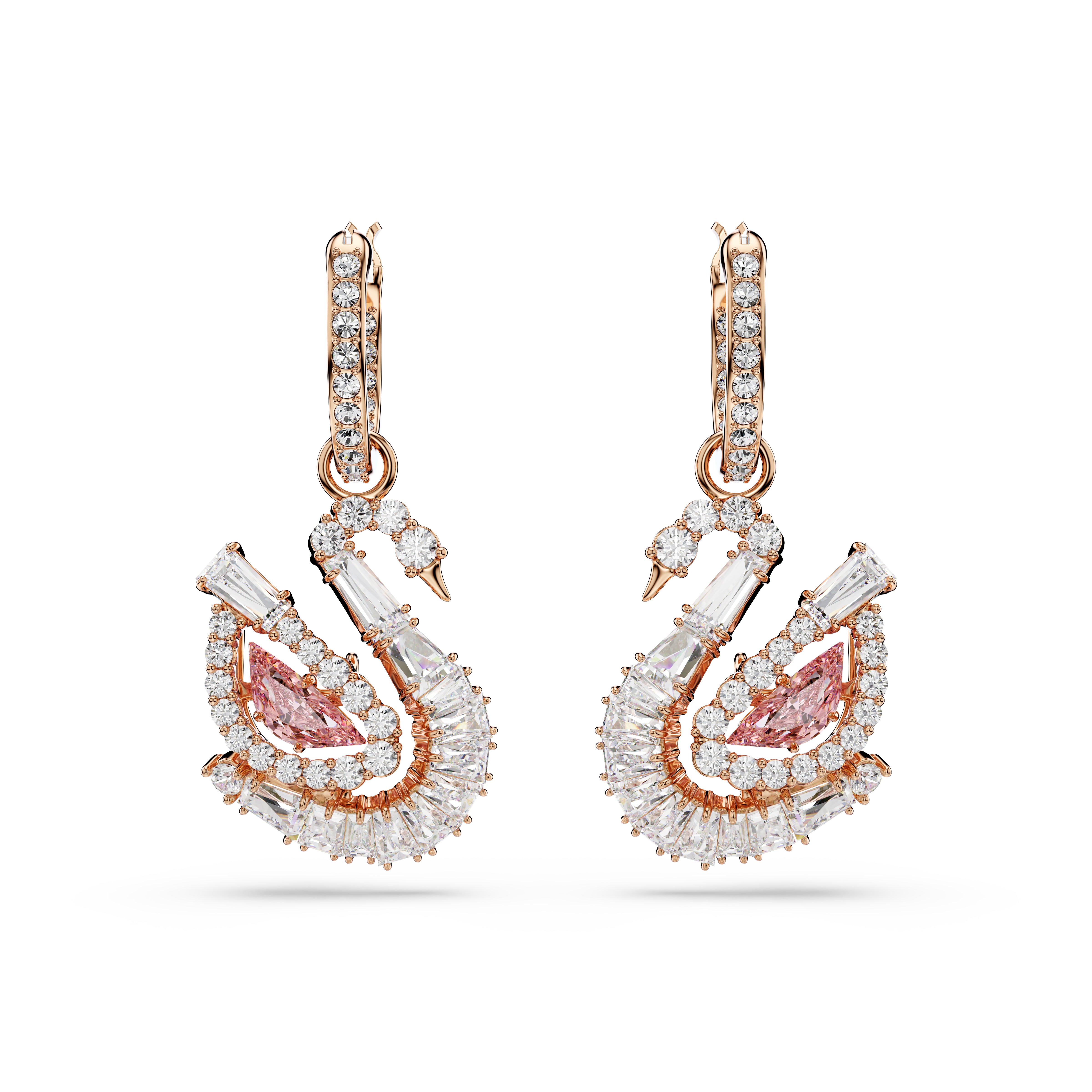 Embrace the delicate movement of Swarovski’s iconic swan with these emblematic earrings. Attached to a mini hoop with shimmering pavé, each graceful silhouette is rose gold-tone plated and adorned in clear Swarovski Zirconia with a pink dancing stone in a swan body cut. This radiant detail creates an endless motion of color and light, and will keep your style shining at every moment.
