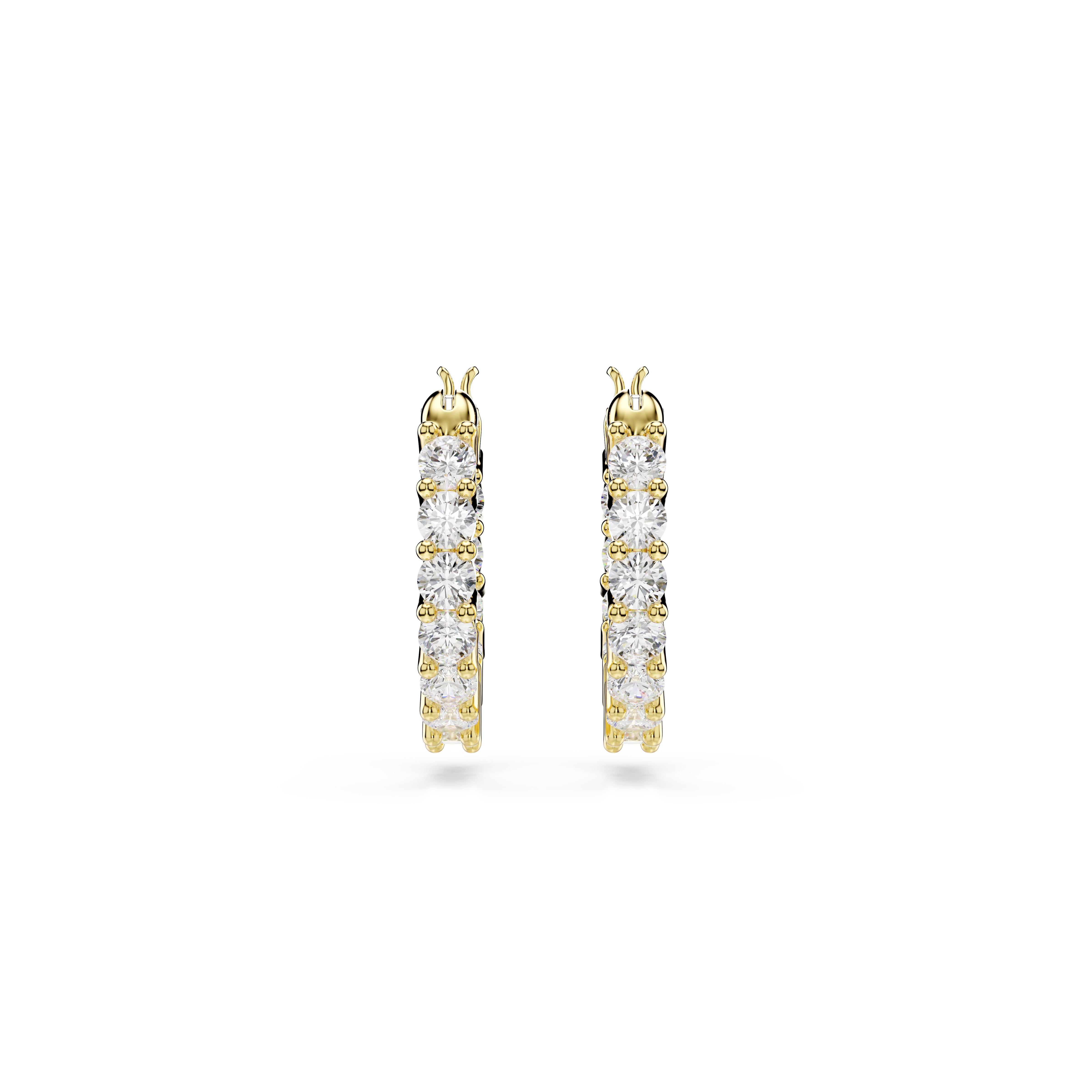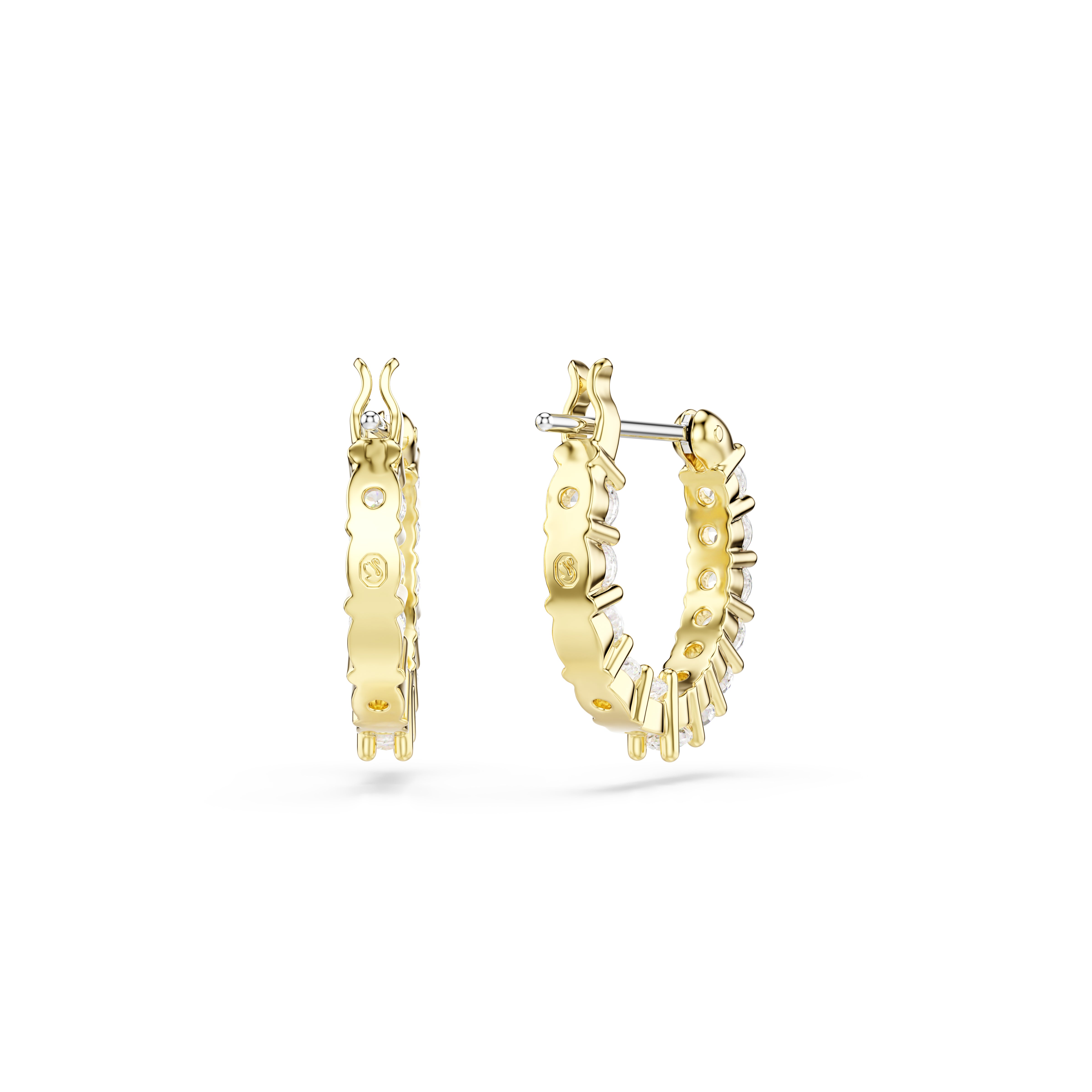 These pierced mini hoops by Swarovski are a radiant and timeless piece of jewelry. Both earrings are gold-tone plated and decorated with numerous Swarovski Zirconia that enhance their attractive look with subtle shimmer. Best worn with matching necklaces and bracelets, these earrings are a delightful gift for everyday wear.