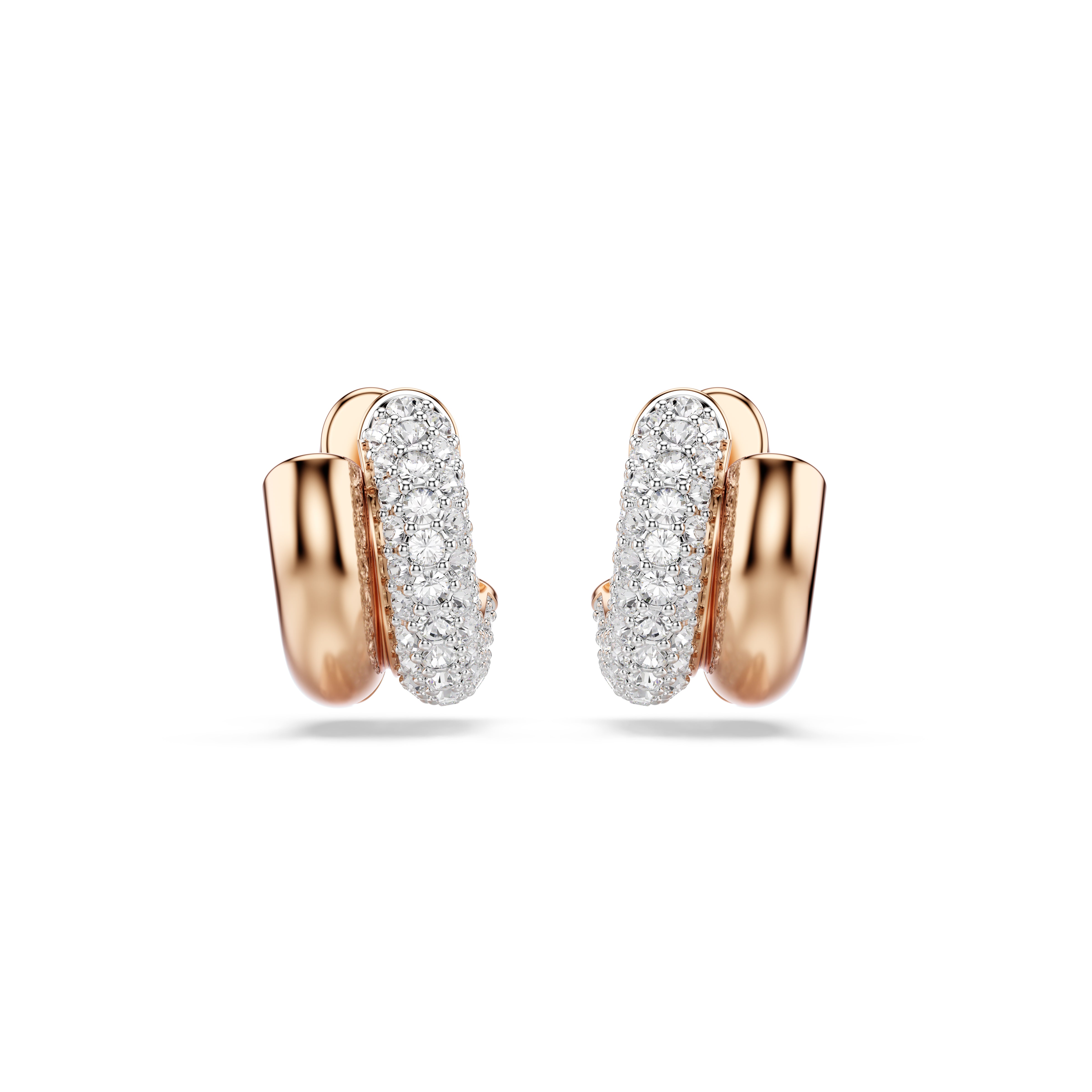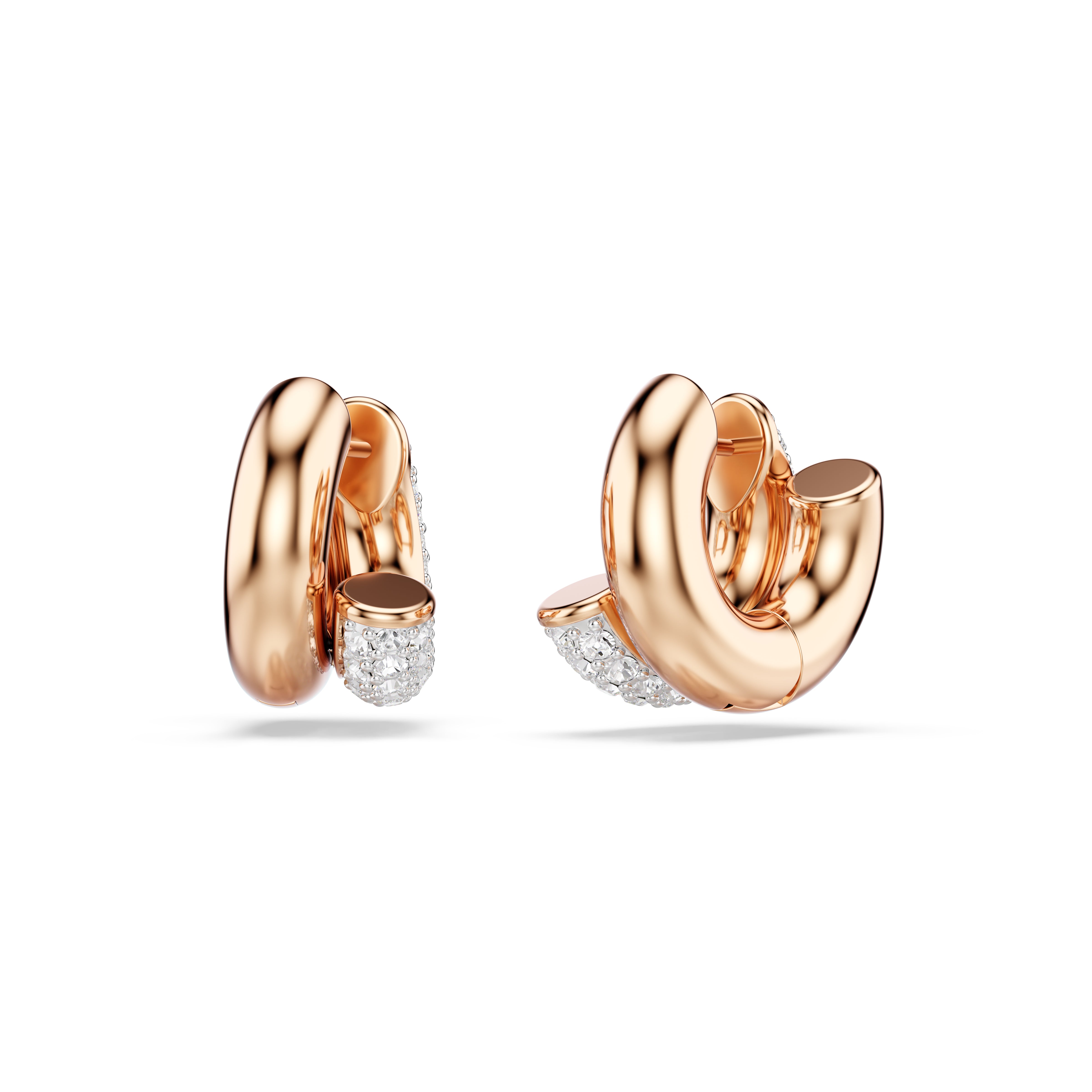 Embodying the industrial style of Dextera, these tubular earrings combine a gleaming rose gold-tone plated surface with a pavé of clear crystals on one side. An additional spring plate mechanism ensures each piece is easy to take on and off. Wear these mini hoops as a distinctive choice for your day to night styling.