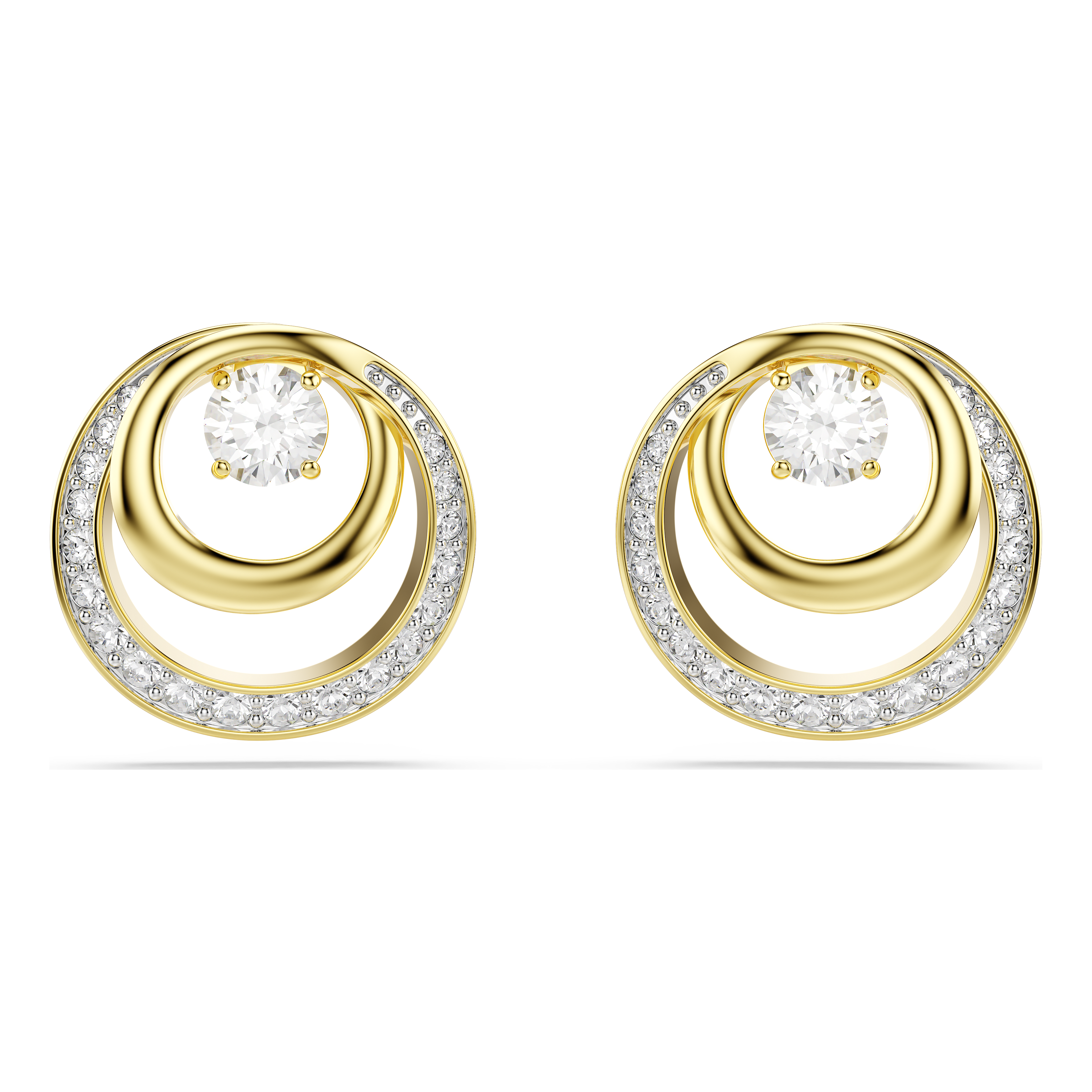 Embrace the circular style of these gold-tone plated Hyperbola earrings. Each hypnotic piece features a central Swarovski Zirconia surrounded by metallic spirals and glittering pavé. Wear them with a matching necklace or a ring to emphasize the modern sophistication.