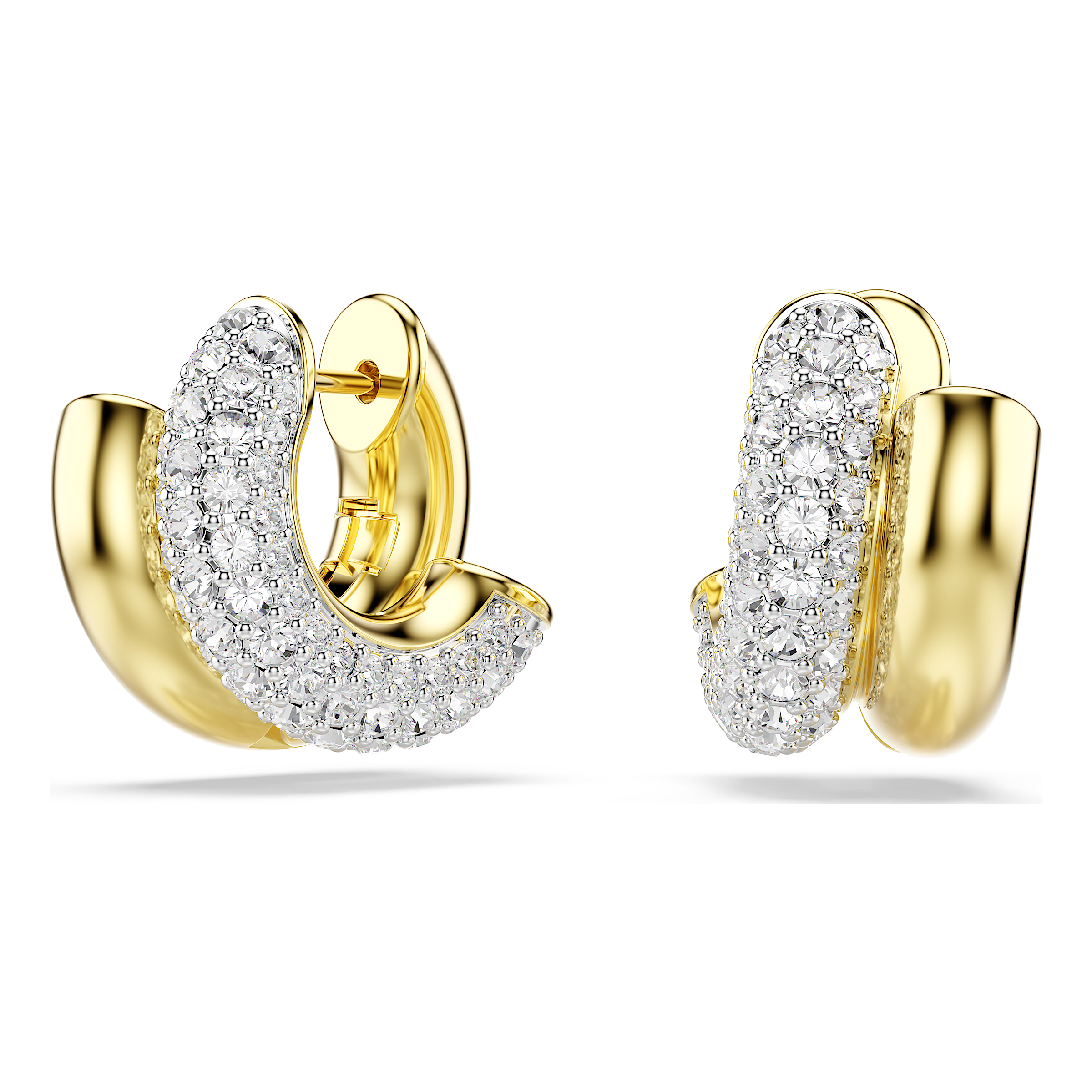 Embodying the industrial style of Dextera, these tubular earrings combine a gleaming gold-tone plated surface with a pavé of clear crystals on one side. An additional spring plate mechanism ensures each piece is easy to take on and off. Wear these mini hoops as a distinctive choice for your day to night styling.