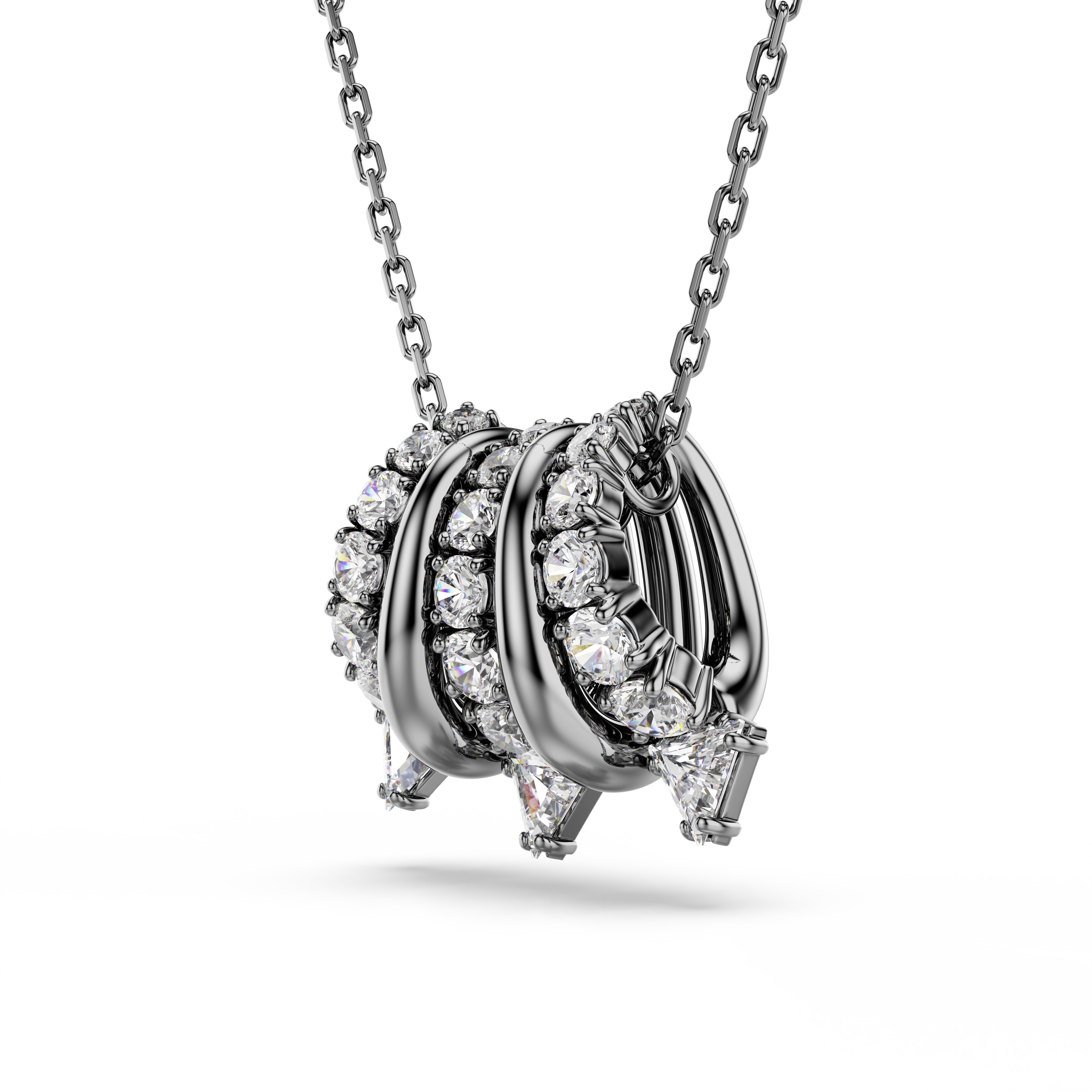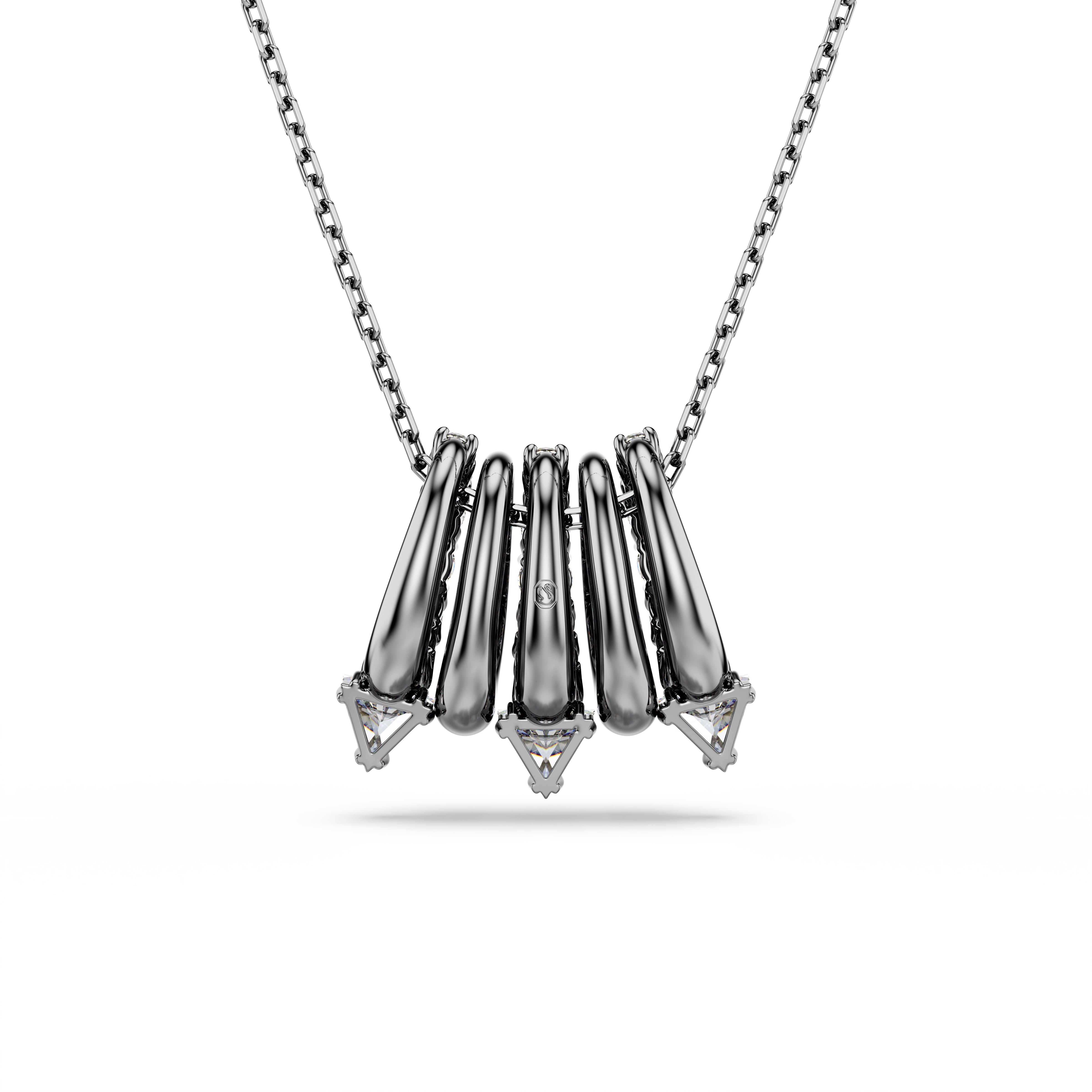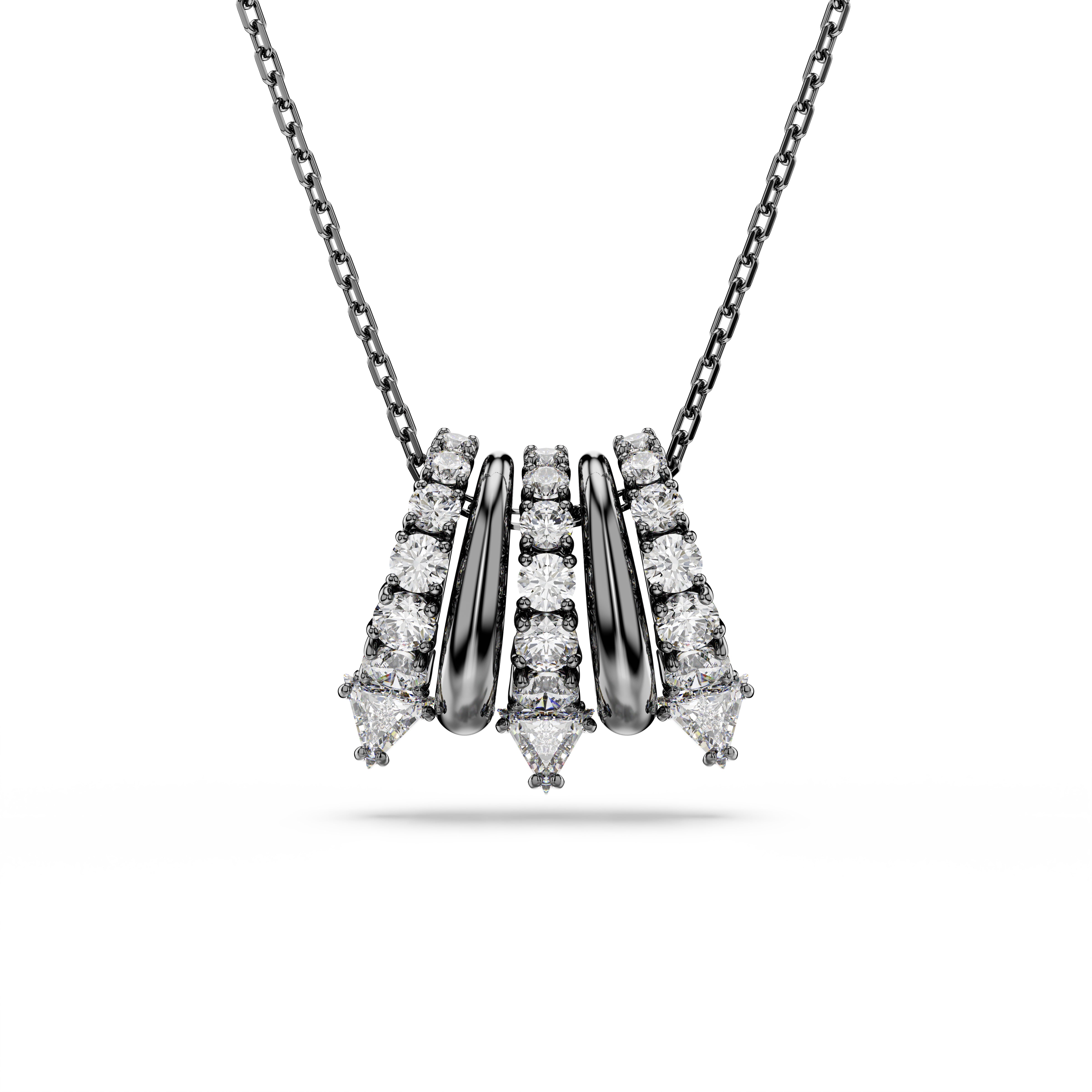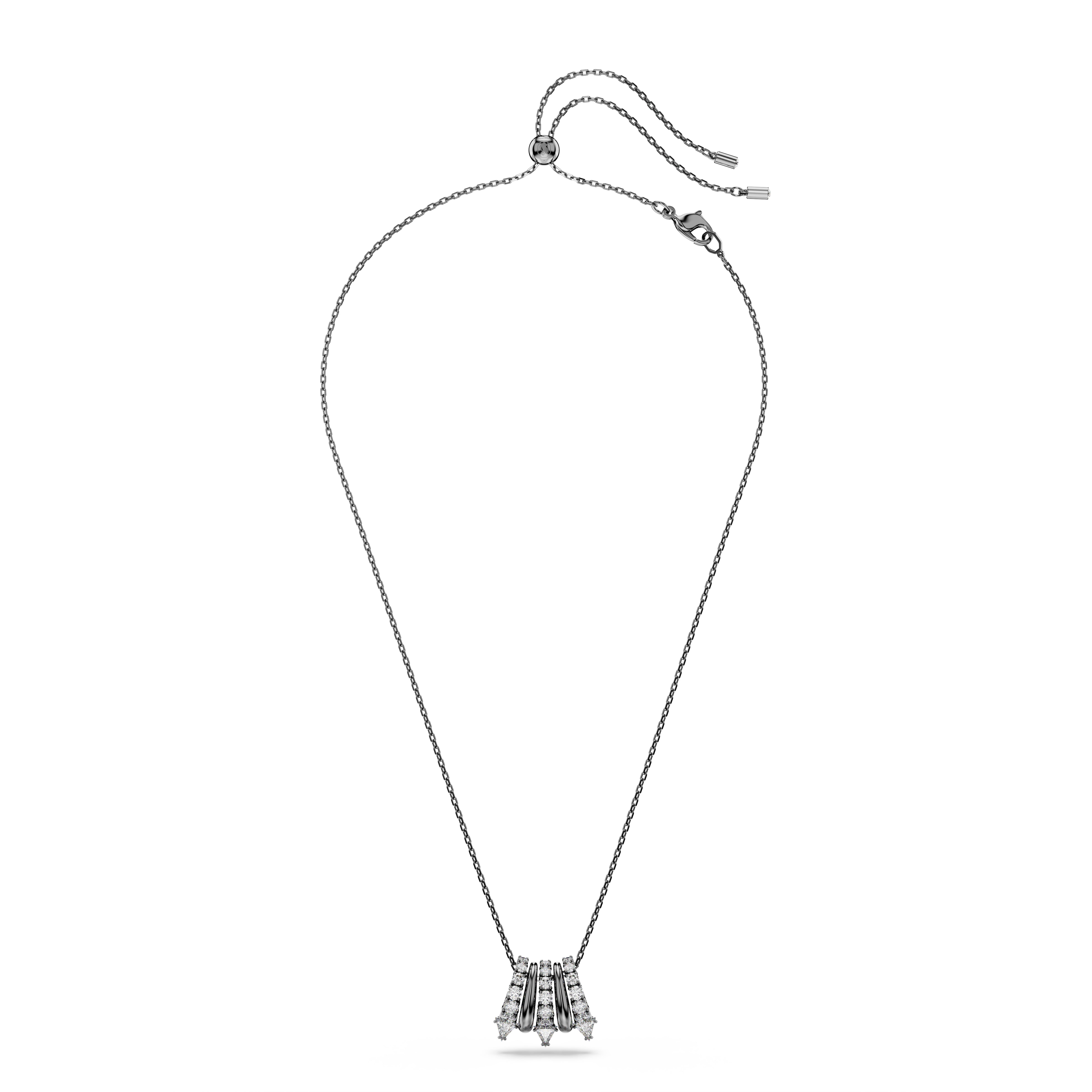 A striking and alternative look for everyday wear. This ruthenium plated pendant is suspended from a delicate chain and features five separate links, including metallic spirals and clear Swarovski Zirconia. The spiky tips add a contemporary finish and match perfectly with the shimmering ear cuffs from the same expressive family.