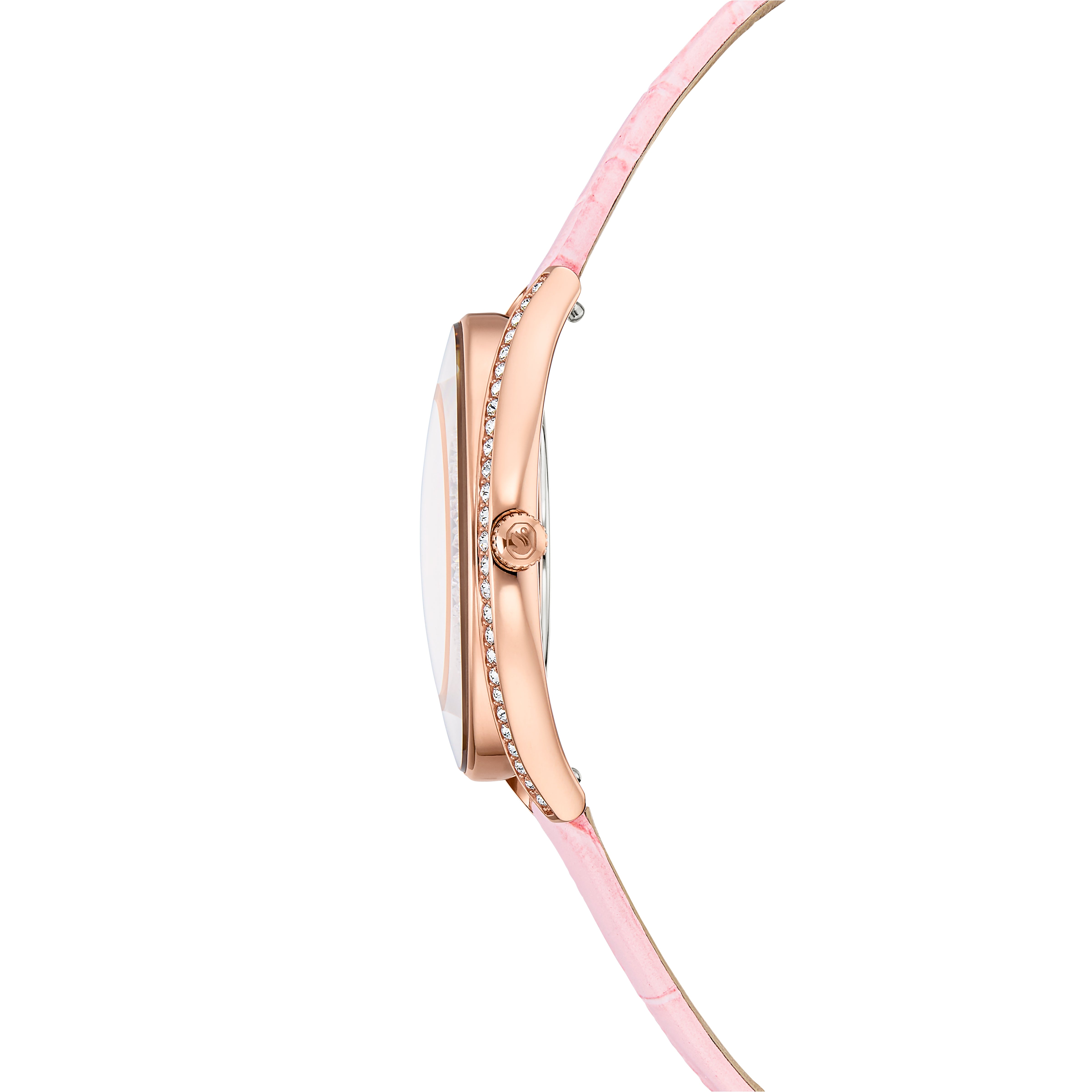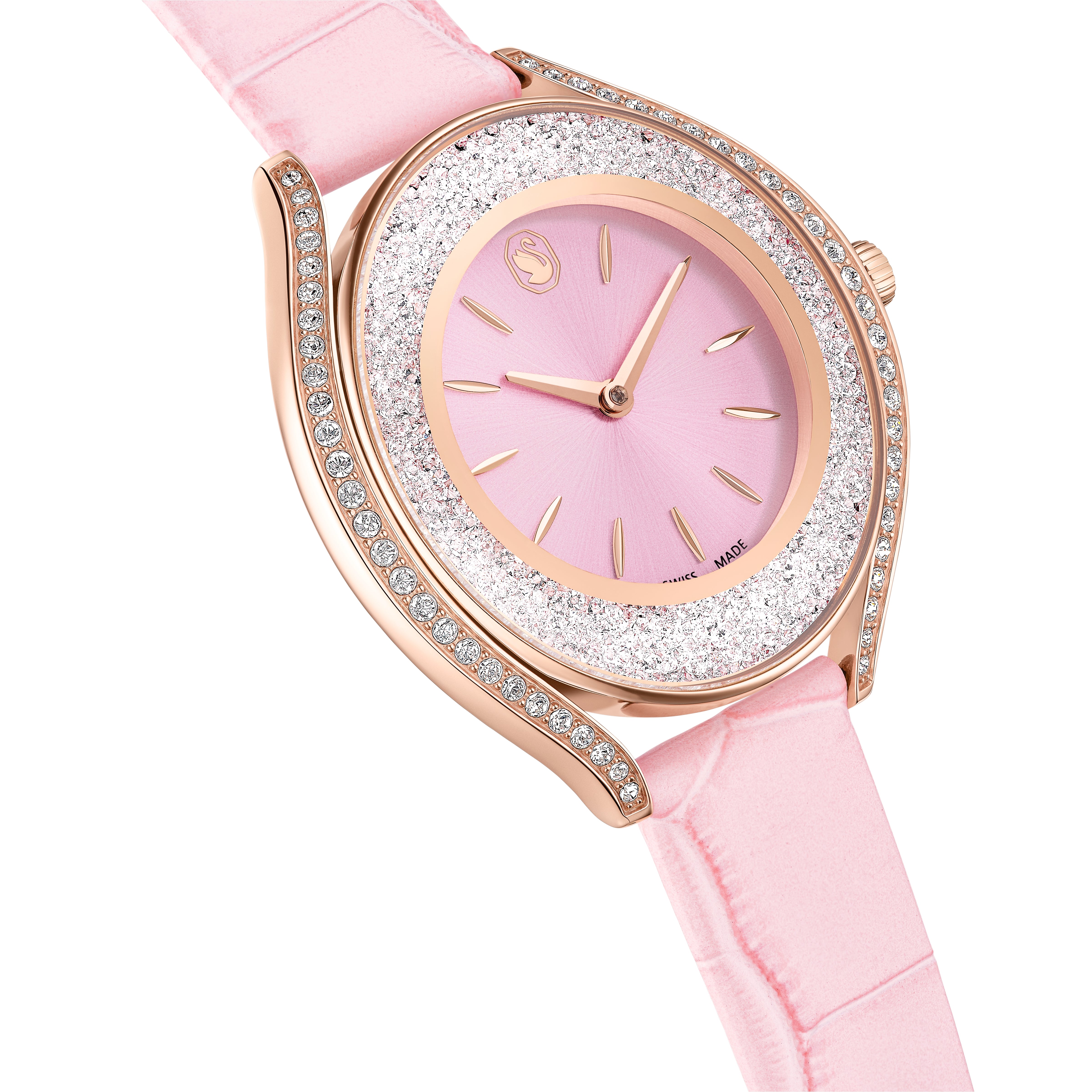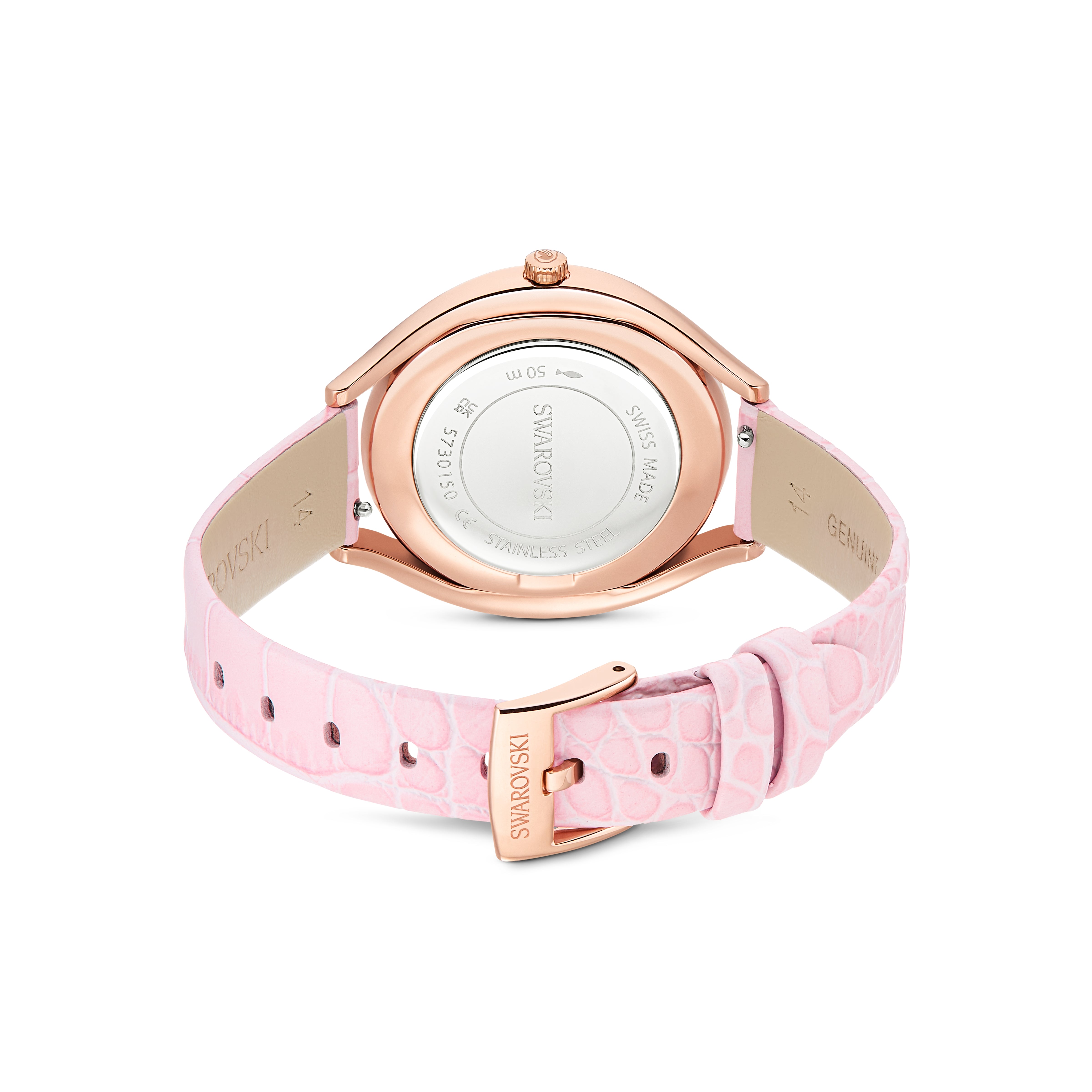 This curvaceous Crystalline watch artfully combines elegance and function. Approximately 1,380 crystals are showcased around the case, which is crafted with a rose gold-tone finish. The sophisticated design is completed with a pink leather strap, a pink sunray dial, and the Swarovski swan at 12 o'clock. This Swiss made watch is water resistant up to 50m.