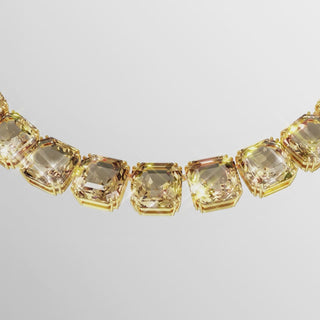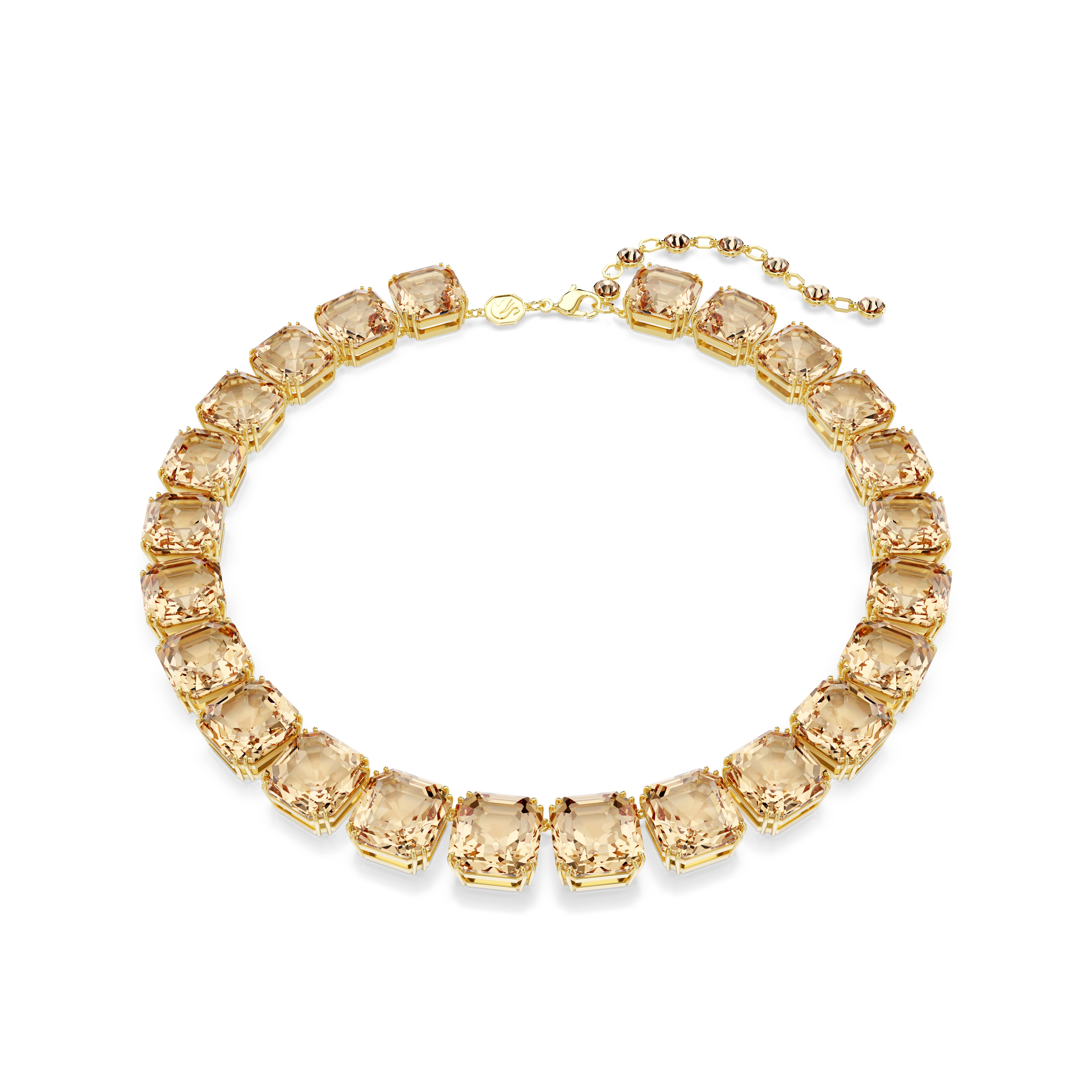 Choose eye-catching luxury with the rich hues of this Millenia necklace. The gold-tone plated style is designed to catch the light, with a fully articulated row of asscher-cut crystals in a warm caramel shade. Each section displays the mastery of Swarovski’s double-prong setting and the piece is completed with a lobster closure and embellished extender. Treat yourself or a loved one.