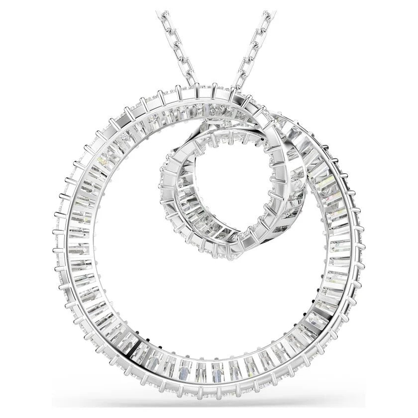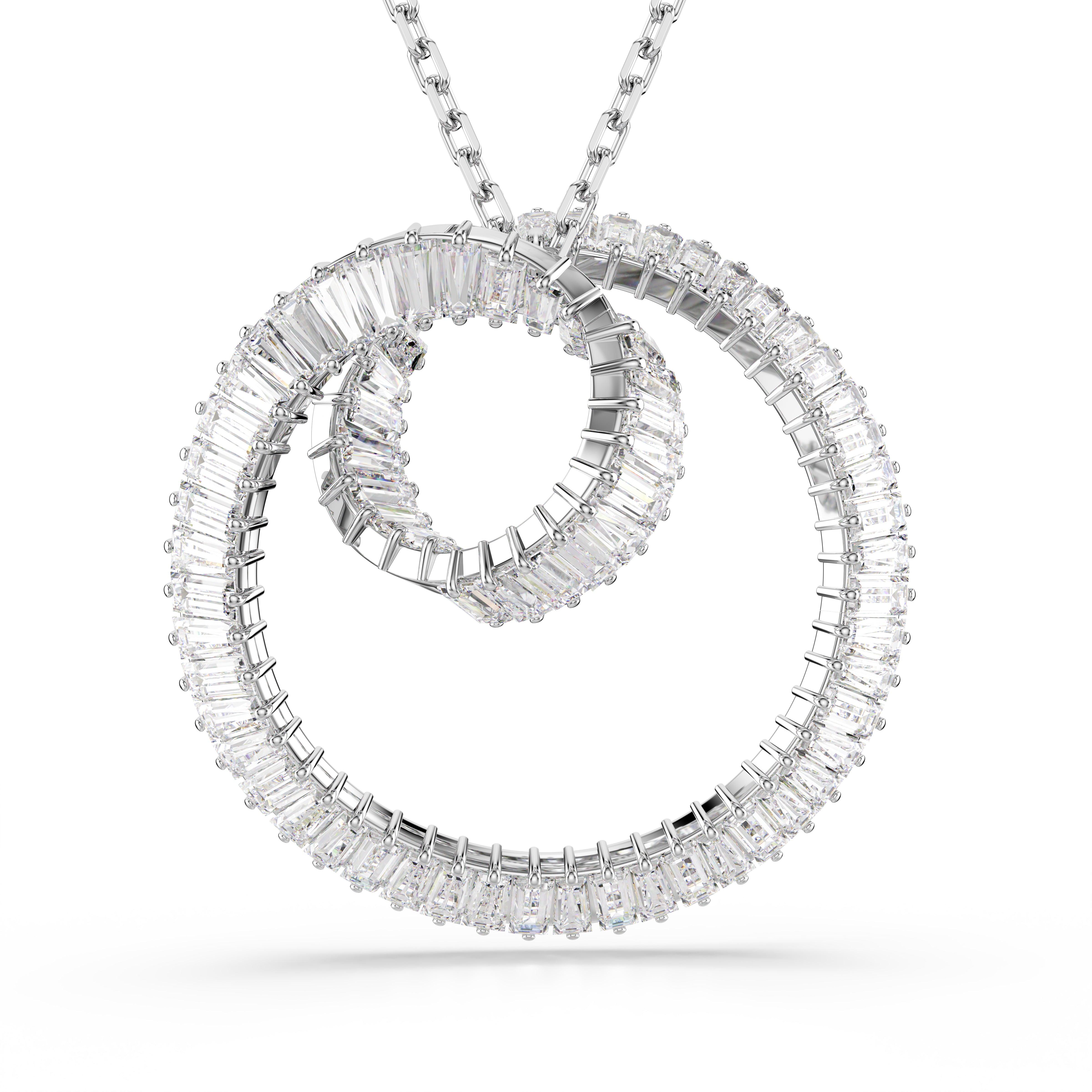 In a dramatic swirl of light, this Matrix pendant combines classic rhodium plating with luminous Swarovski Zirconia. Suspended from a long chain, the central motif offers a swirling vision of an elegant ribbon, created with a full strand of baguette cuts in prong settings. This pendant is an effortless way to add radiance to any outfit and combines wonderfully with a matching pair of earrings from the same Matrix family.