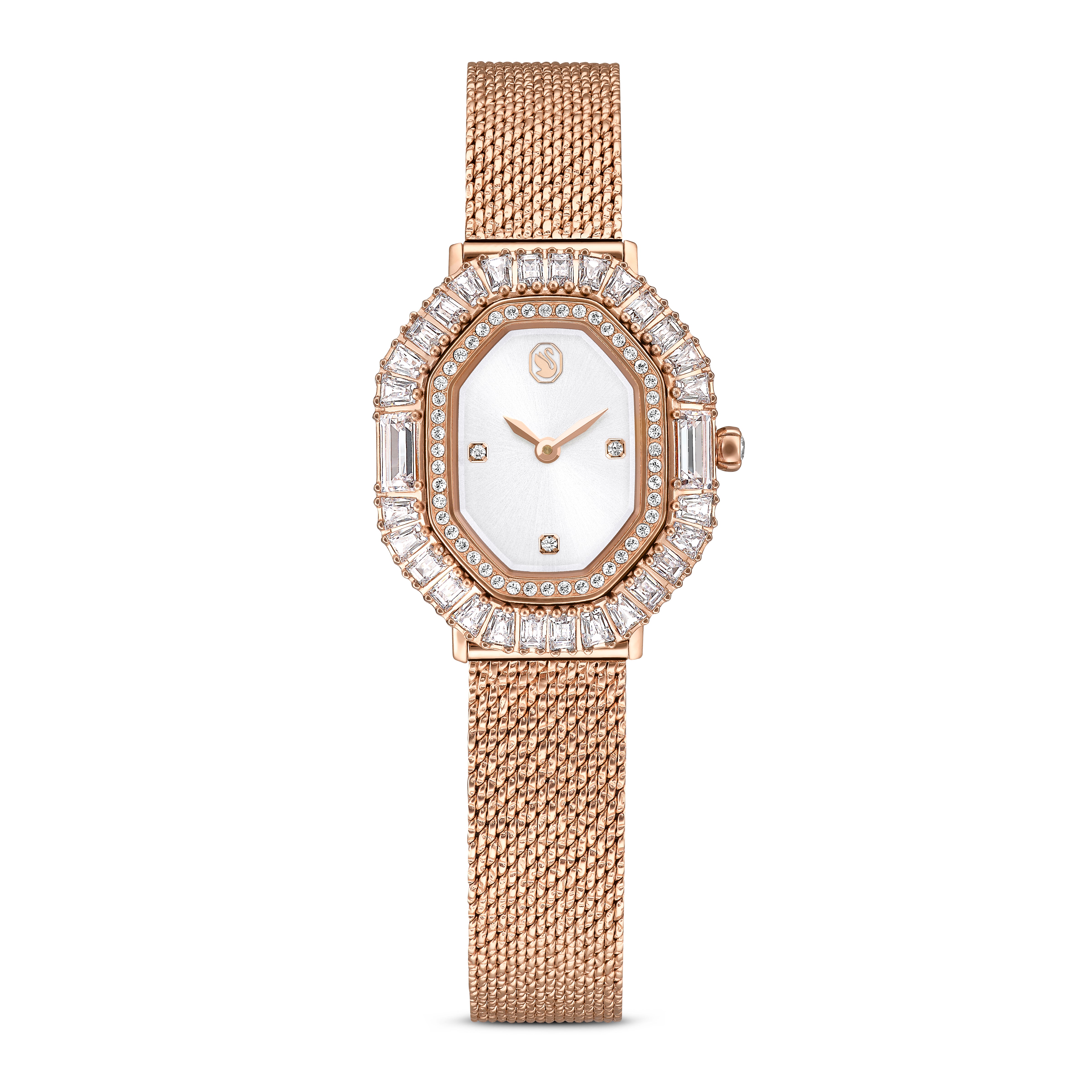This innovative timepiece is a one-of-a-kind creation that combines signature design with mastery of light. Crafted with genuine savoir-faire, the watch is inspired by the Matrix jewelry family and features a 13 x 18 mm stainless steel case with a rose gold-tone finish. The bezel is presented in the House's signature octagon shape and is set with a stunning mix of 78 round and fancy cut crystals and Swarovski Zirconia. This provides a radiant frame for the minimalist sunray dial, which elegantly displays three crystal hour markers and a swan logo. A single crystal is also placed within the crown, while around the wrist, the luxury is heightened further by an adjustable mesh bracelet. This watch is water-resistant to 50m and symbolizes Swarovski’s modern luxury at its finest.
