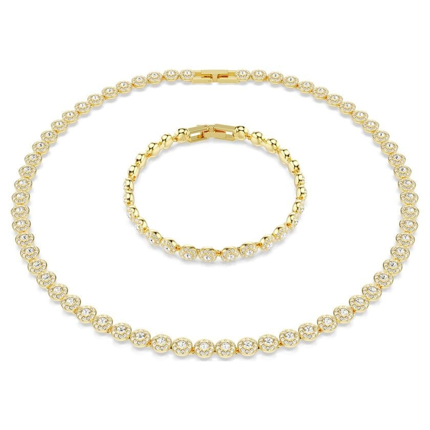Harmonizing luxury throughout your style, this gold-tone plated set was born to shine. Each piece features a full surround of round-cut crystals, each framed by a halo of clear pavé. This includes the dainty motifs on both the necklace and the bracelet. The foldover clasps deliver a seamless closure, while the additional extenders mean you can adjust the jewelry for both comfort and size. Wear these pieces together whenever you need a look of all-over glamour.