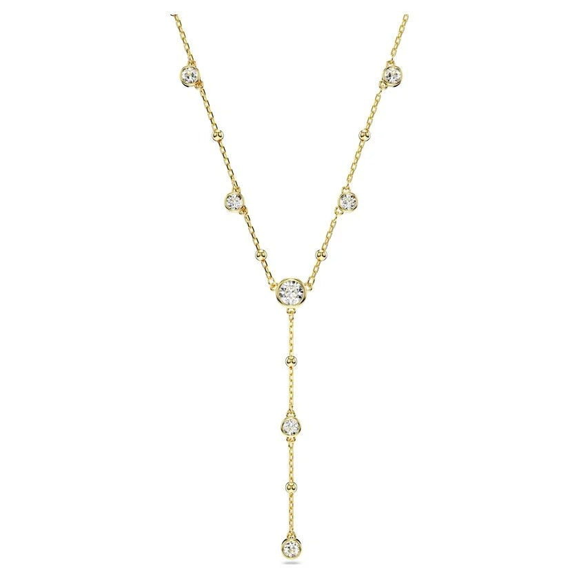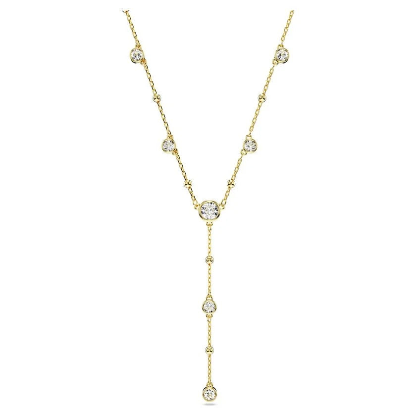 With its distinctive shape, this Imber necklace makes a perfect addition to your jewelry. The design features a gold-tone plated chain, accented with an array of shiny metal droplets and dazzling round-cut crystals in a puffy bezel setting. A delicate strand drops elegantly in the middle, while a single Swarovski Zirconia is placed in the elongation for added luxury. Pair this piece with some Imber earrings for an eye-catching style match.