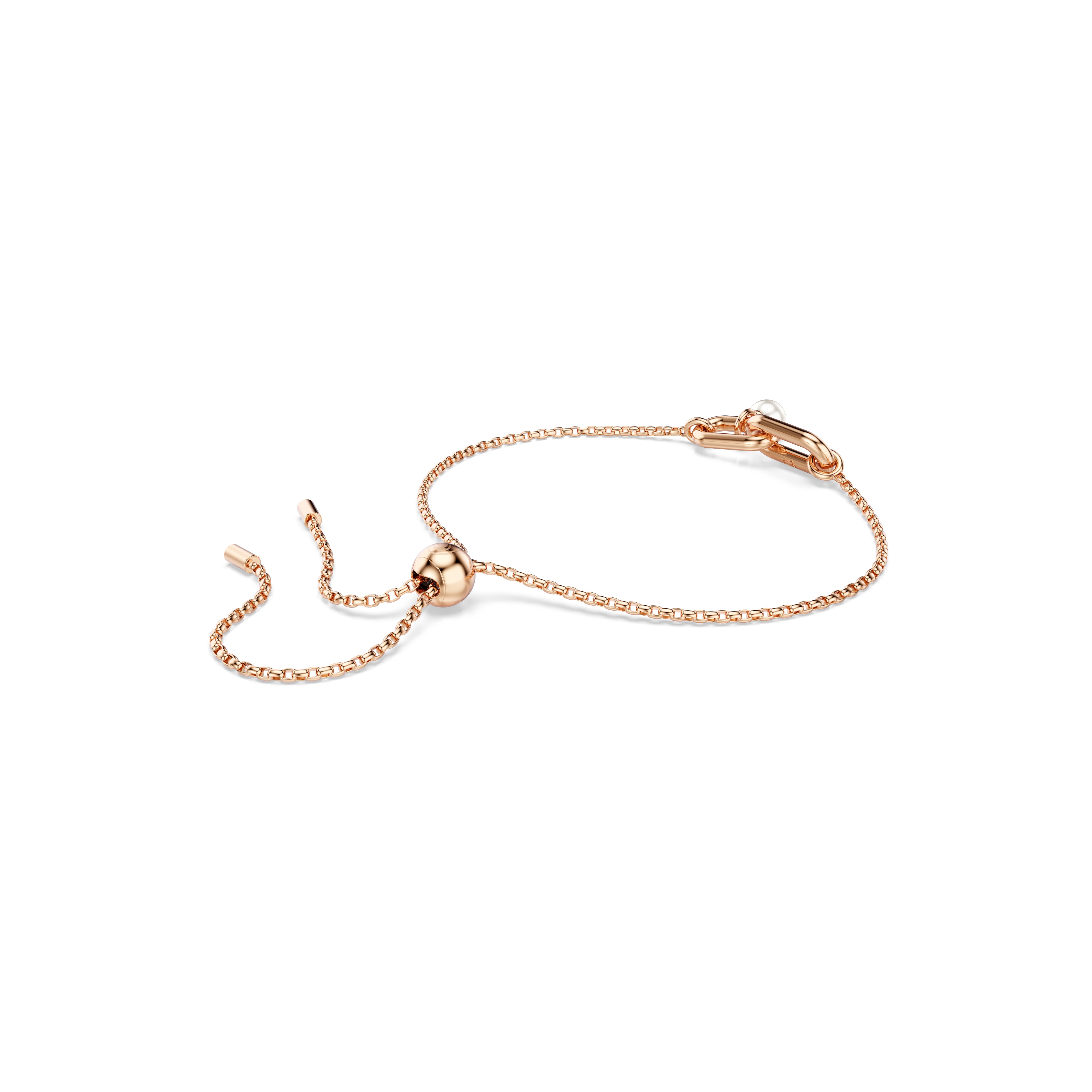 Created for sheer elegance, this Constella bracelet is rose gold-tone plated and features two interconnecting links, with one adorned in clear pavé. A single Swarovski Crystal Pearl delicately hangs beneath, while the sliding closure allows for an adjustable fit. For a harmonized look, pair this bracelet with matching earrings or a pendant from the same family.