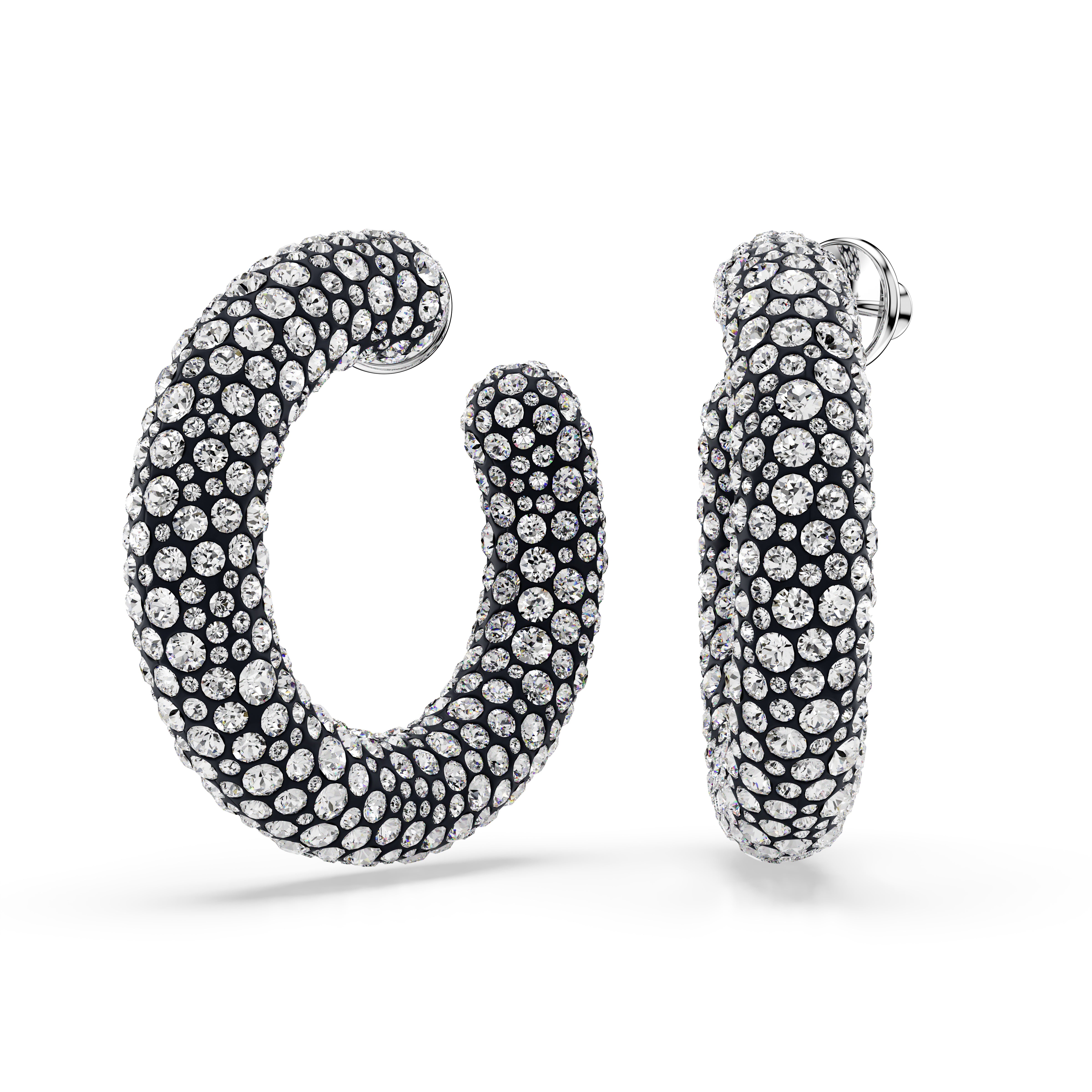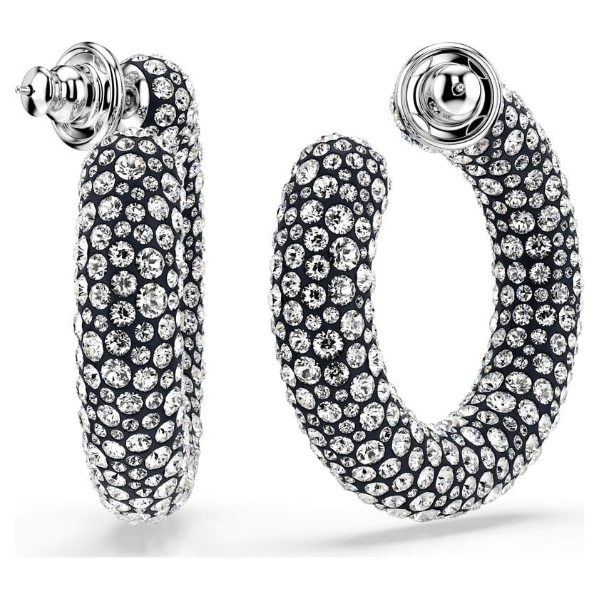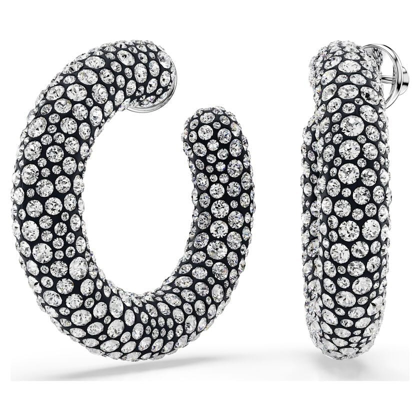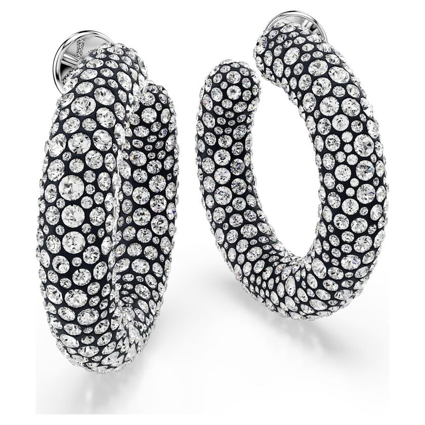 These large Sublima earrings have a light-filled twist on the classic hoop style. Each rhodium plated piece features a stunning decoration of clear crystals, set in place using the Pointiage® technique. Wear them as your own glamorous accessory or give them as a wondrous gift.
